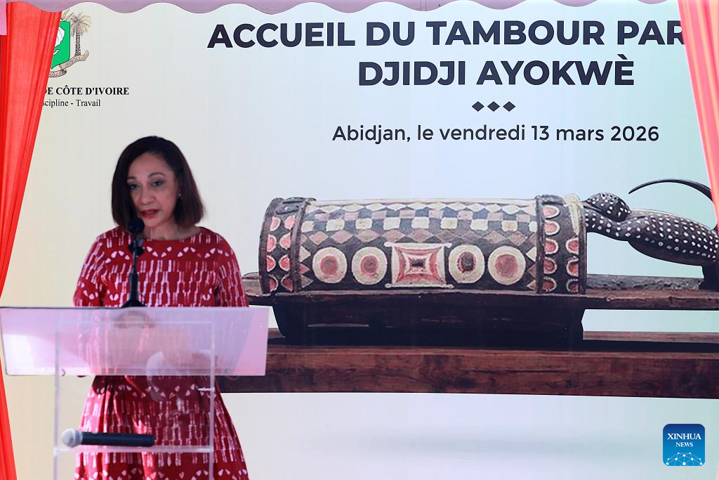 ABIDJAN, March 13 (Xinhua) -- The talking drum Djidji Ayôkwè, a sacred object of the Atchan people of Abidjan that was confiscated by French colonial authorities in 1916, has returned to its land of origin, it was observed Friday during an official ceremony.