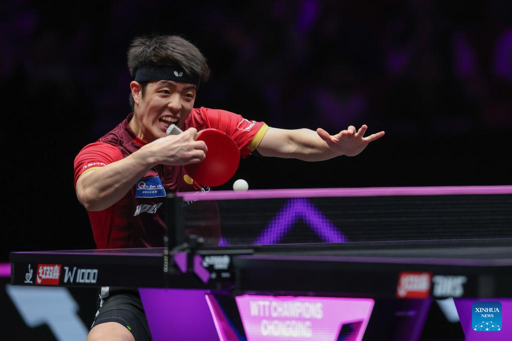 Wen Ruibo of China celebrates after winning the men's singles quarterfinal match between Wen Ruibo of China and Qiu Dang of Germany at the WTT Champions Chongqing 2026 in southwest China's Chongqing, March 14, 2026. (Xinhua/Tang Yi)