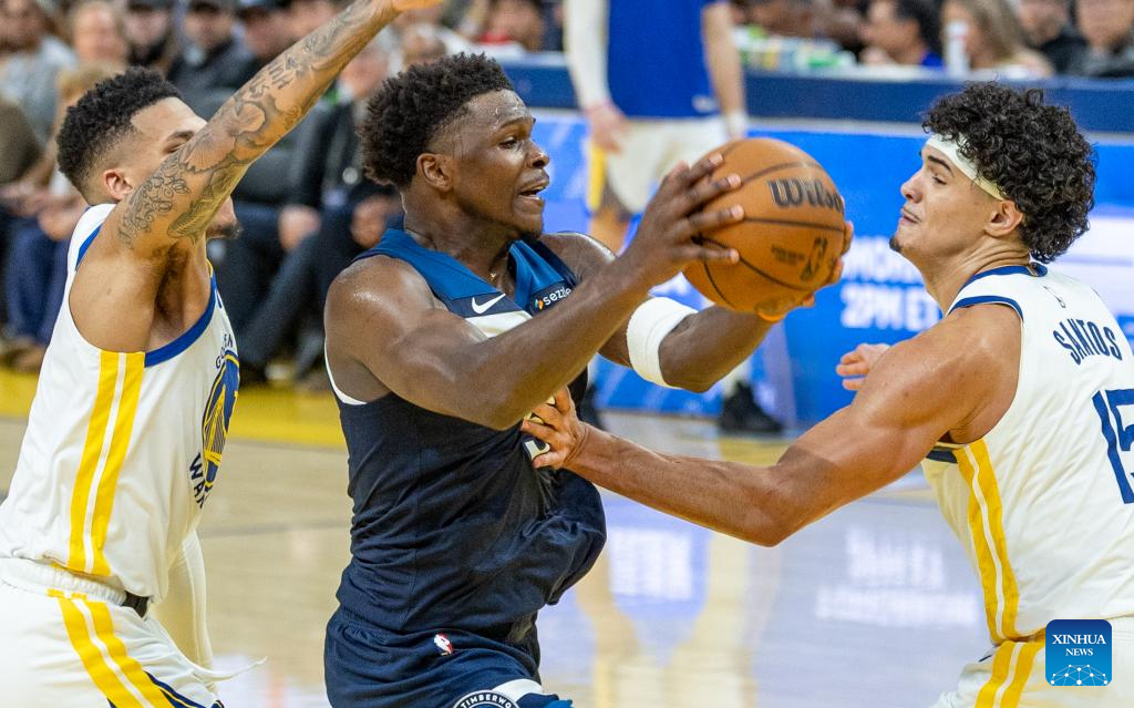 Minnesota Timberwolves' Anthony Edwards (C) dribbles during the 2025-2026 NBA regular season basketball game between Minnesota Timberwolves and Golden State Warriors in San Francisco, the United States, March 13, 2026. (Photo by Dong Xudong/Xinhua)