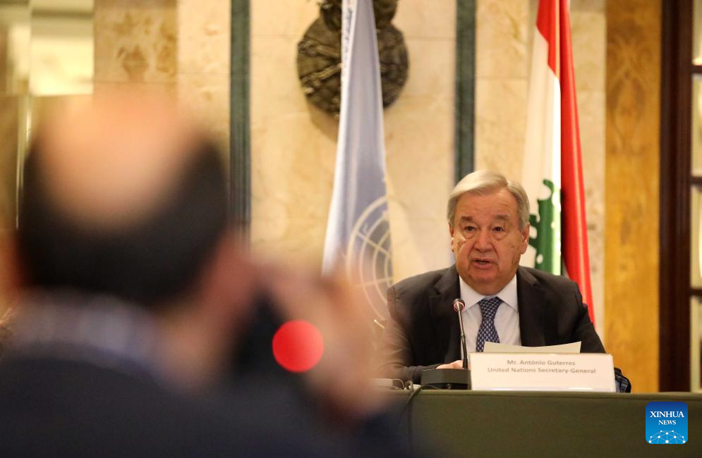 Guterres called for an immediate de-escalation between Israel and Lebanon during a press conference in Beirut on Saturday, warning that escalating violence risks devastating large parts of the country. (Photo by Bilal Jawich/Xinhua)
