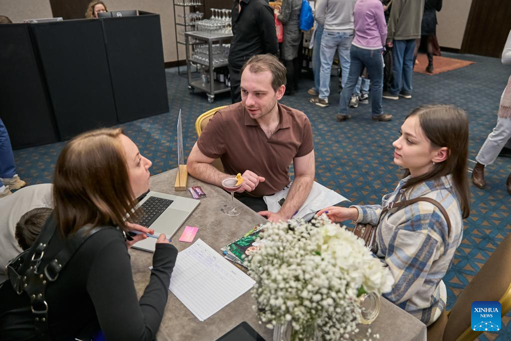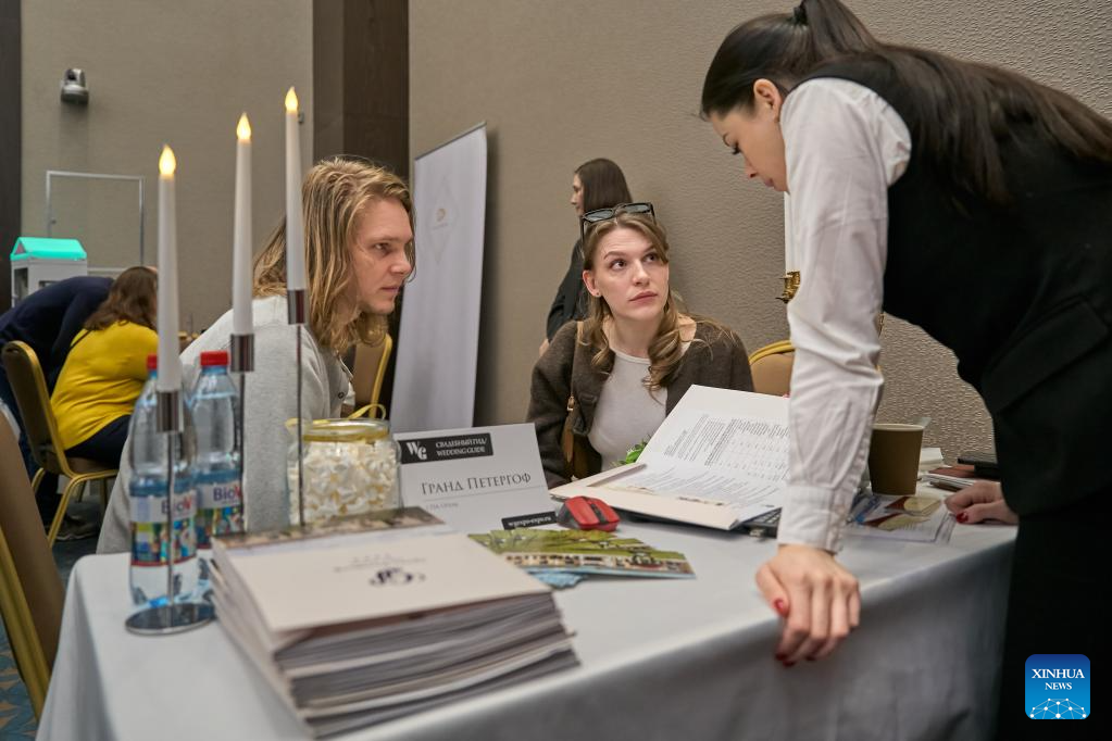 A young couple seeks wedding consultations at a wedding expo in St. Petersburg, Russia, March 15, 2026. Dozens of wedding service providers showcase a range of wedding-related services at the wedding expo, including bridal makeup, wedding hosting, wedding photography, wedding planning and so on. (Photo by Guo Feizhou/Xinhua)