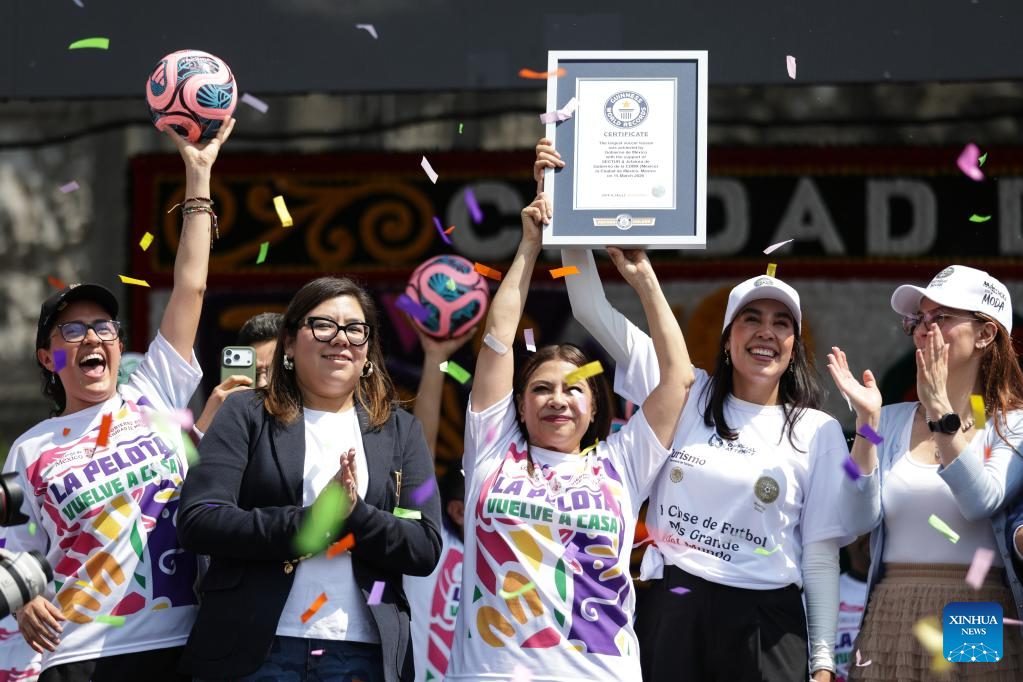 Mexico City Head of Government Clara Brugada Molina (C) holds the Guinness world record certificate for the largest football lesson in the world held at the Zocalo in Mexico City, capital of Mexico, on March 15, 2026. Mexico City on Sunday secured the Guinness world record for the largest football class in the world. (Photo by Francisco Canedo/Xinhua)