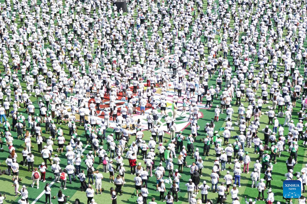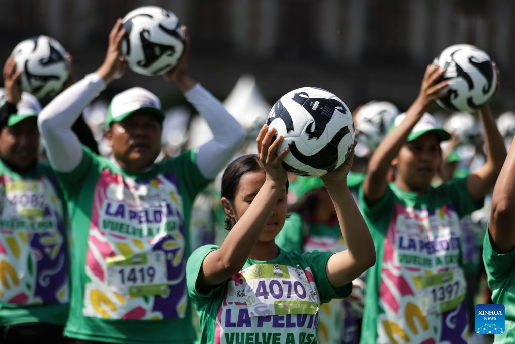 People take part in the largest football lesson in the world held at the Zocalo in Mexico City, capital of Mexico, on March 15, 2026. Mexico City on Sunday secured the Guinness world record for the largest football class in the world. (Photo by Francisco Canedo/Xinhua)