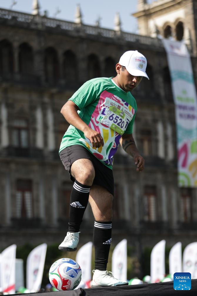 A man takes part in the largest football lesson in the world held at the Zocalo in Mexico City, capital of Mexico, on March 15, 2026. Mexico City on Sunday secured the Guinness world record for the largest football class in the world. (Photo by Francisco Canedo/Xinhua)