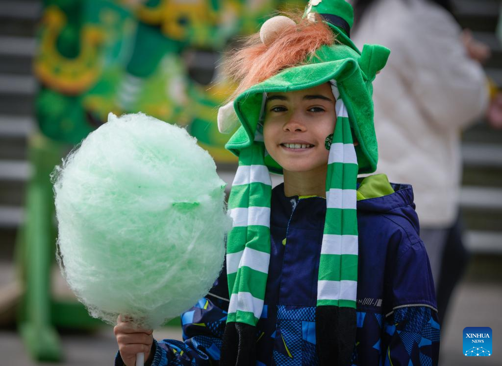 A boy in festive costume enjoys a cotton candy during the Family Day event of CelticFest in Vancouver, British Columbia, Canada, March 15, 2026. The annual CelticFest brings the local community in celebration of Celtic culture, featuring live Celtic music, Irish dance performances and family-friendly activities. (Photo by Liang Sen/Xinhua)