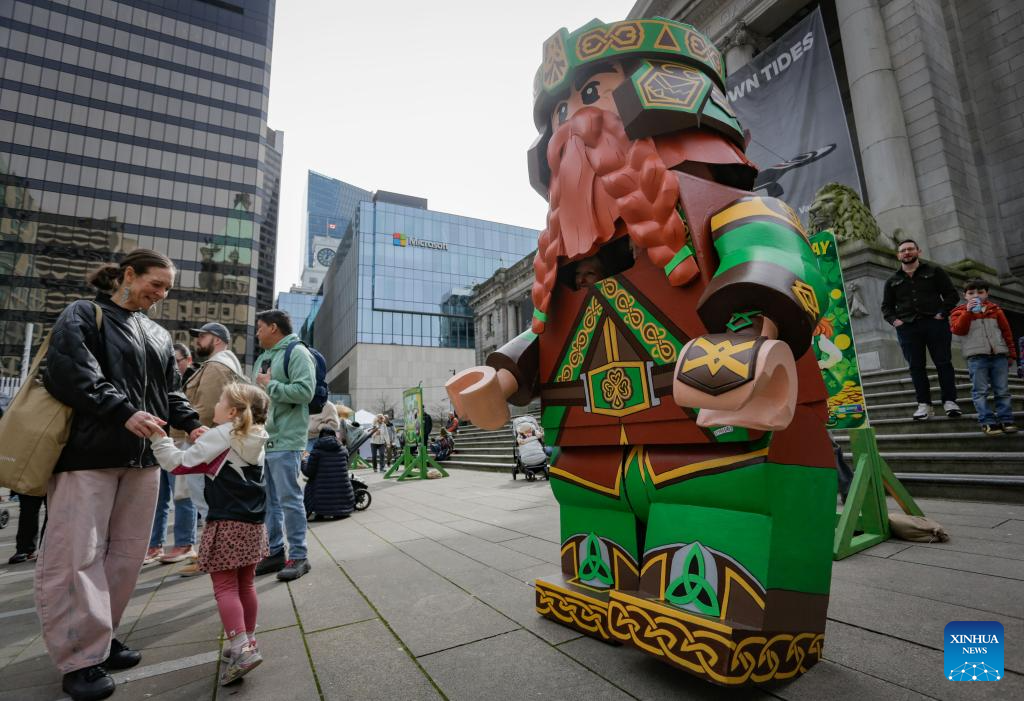 A reveler wearing a giant Lego-style warrior costume attends the Family Day event of CelticFest in Vancouver, British Columbia, Canada, March 15, 2026. The annual CelticFest brings the local community in celebration of Celtic culture, featuring live Celtic music, Irish dance performances and family-friendly activities. (Photo by Liang Sen/Xinhua)