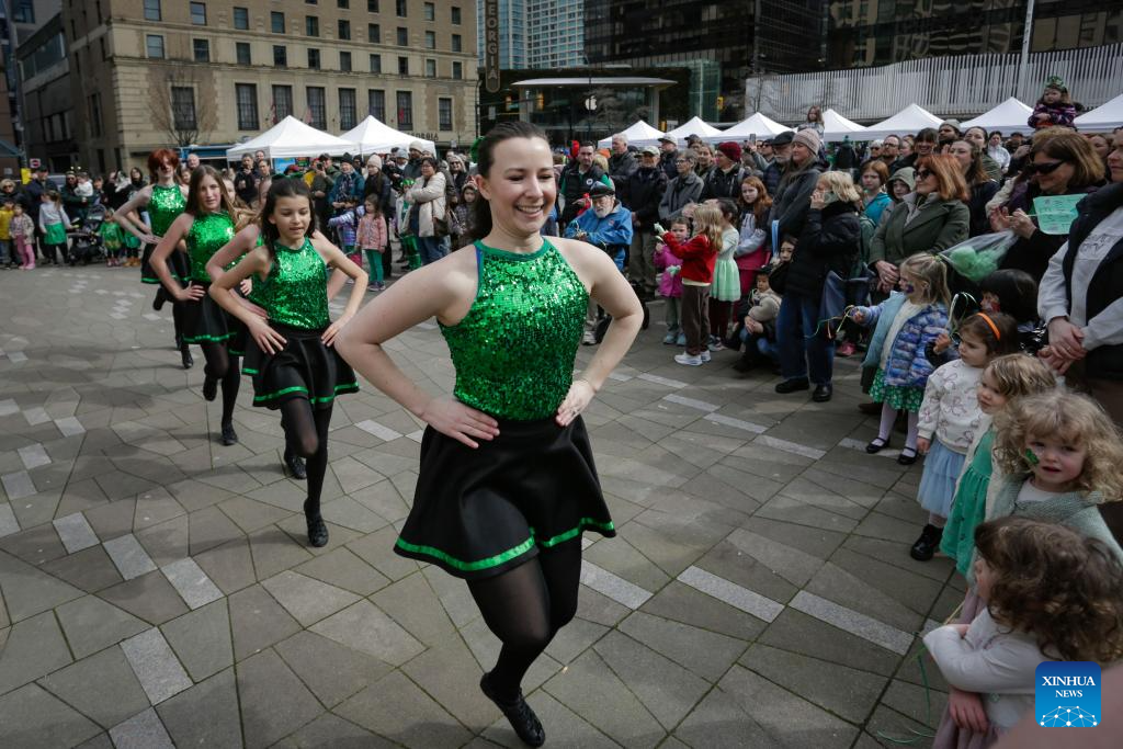 People watch an Irish dance performance during the Family Day event of CelticFest in Vancouver, British Columbia, Canada, March 15, 2026. The annual CelticFest brings the local community in celebration of Celtic culture, featuring live Celtic music, Irish dance performances and family-friendly activities. (Photo by Liang Sen/Xinhua)