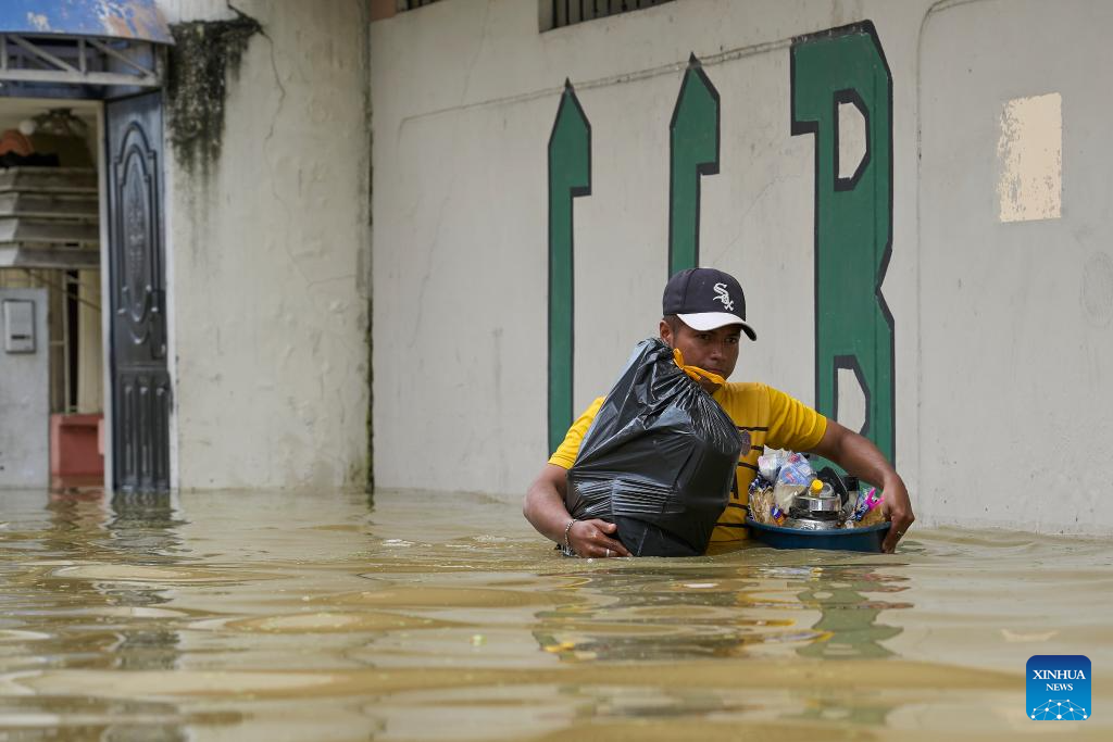 A man carries belongings in the flood in Babahoyo, Los Rios, Ecuador, March 15, 2026. According to local authorities, at least 11 people were dead in Ecuador due to the rain-triggered flood and landslides this year. (Photo by Ricardo Landeta/Xinhua)