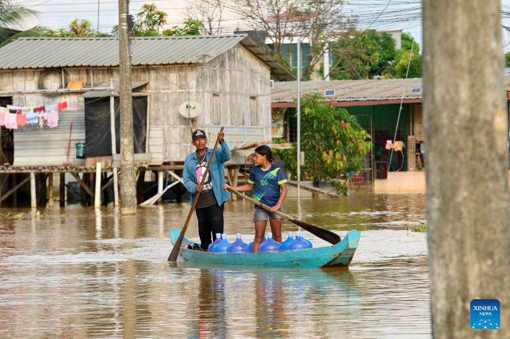 People row a boat in the flood in Babahoyo, Los Rios, Ecuador, March 15, 2026. According to local authorities, at least 11 people were dead in Ecuador due to the rain-triggered flood and landslides this year. (Photo by Ricardo Landeta/Xinhua)