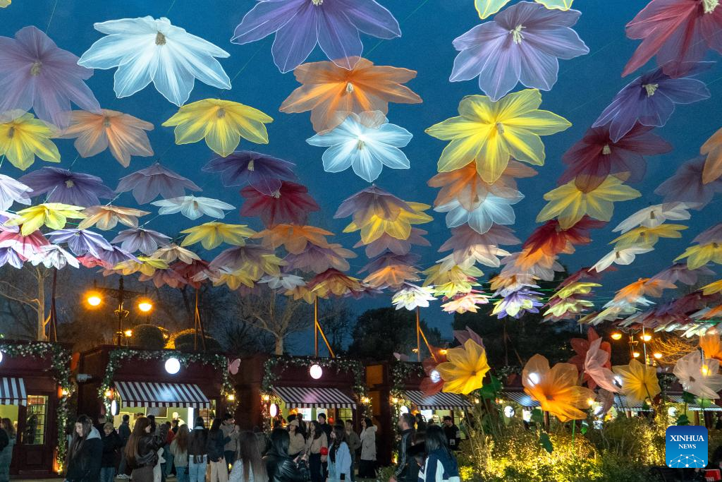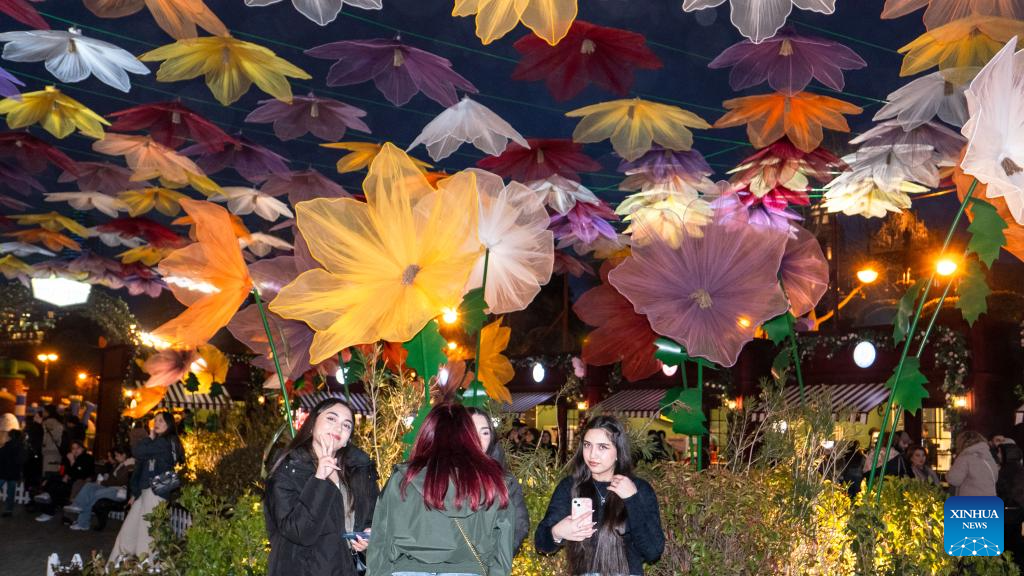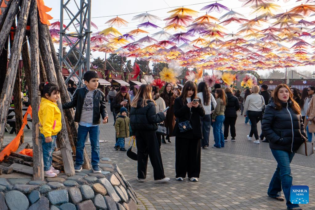 People enjoy festive decorations in a seaside park before Nowruz festival in Baku, Azerbaijan, March 16, 2026. (Xinhua/Chen Junfeng)