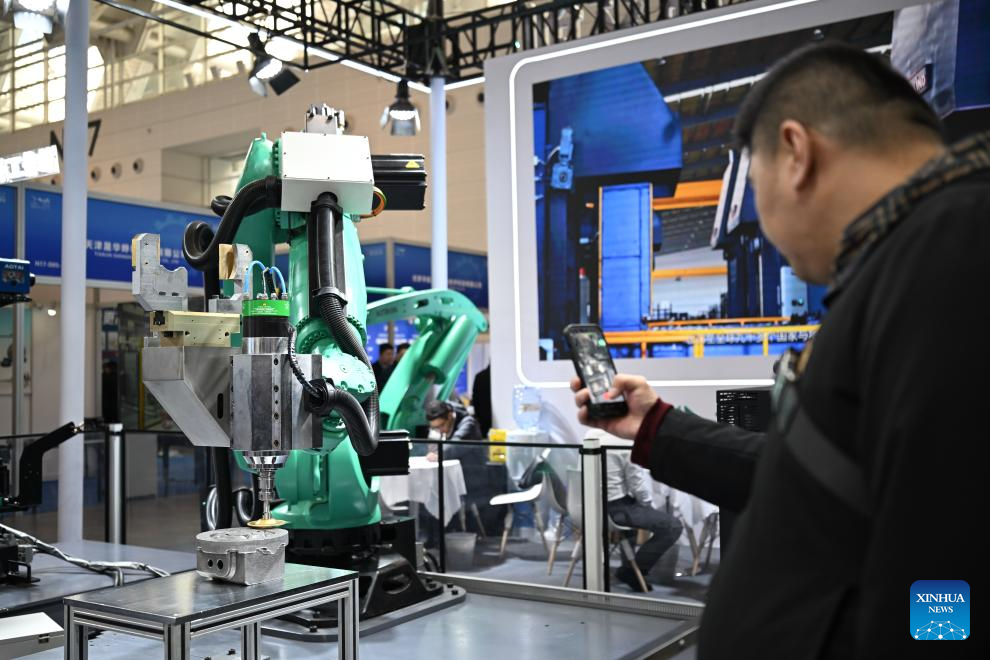 A robotic arm is on display at the 22nd China (Tianjin) International Equipment & Manufacturing Industry Expo (CIEX) in north China's Tianjin, March 18, 2026. The four-day expo kicked off here on Wednesday, attracting over 800 enterprises from home and abroad to participate. (Xinhua/Sun Fanyue)