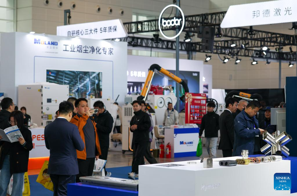 A visitors views a grinding workstation at the 22nd China (Tianjin) International Equipment & Manufacturing Industry Expo (CIEX) in north China's Tianjin, March 18, 2026. The four-day expo kicked off here on Wednesday, attracting over 800 enterprises from home and abroad to participate. (Xinhua/Sun Fanyue)