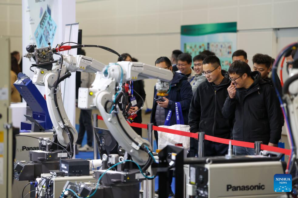 Visitors view industrial robots at the 22nd China (Tianjin) International Equipment & Manufacturing Industry Expo (CIEX) in north China's Tianjin, March 18, 2026. The four-day expo kicked off here on Wednesday, attracting over 800 enterprises from home and abroad to participate. (Xinhua/Sun Fanyue)