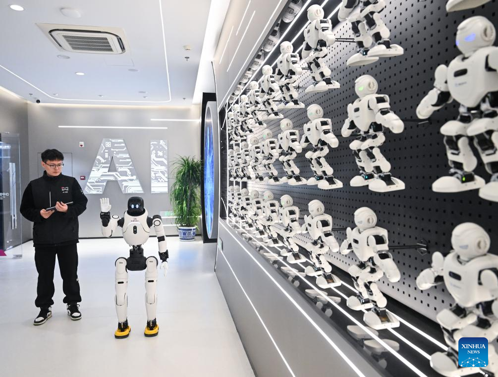 A humanoid robot greets people at an artificial intelligence distribution center in Nanjing, east China's Jiangsu Province, on Dec. 4, 2025. (Xinhua/Ji Chunpeng)