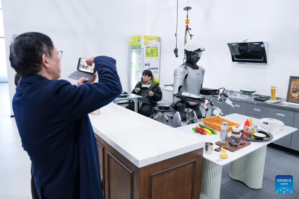 An employee demonstrates how a robot can be used in different scenarios at the Suzhou Embodied Artificial Intelligence Robotics Innovation Center in Suzhou, east China's Jiangsu Province, on March 10, 2026. (Xinhua/Li Bo)