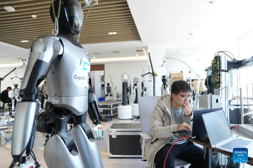 People watch a humanoid robot train in multiple training scenarios at the Suzhou Embodied Artificial Intelligence Robotics Innovation Center in Suzhou, east China's Jiangsu Province, on March 10, 2026. (Xinhua/Li Bo)