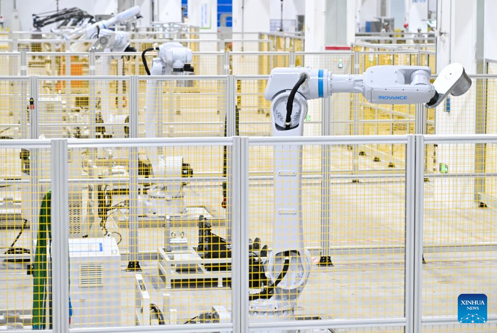 This photo taken on March 17, 2026 shows robots at a workshop of Inovance Group in Jiangning District of Nanjing, east China's Jiangsu Province.