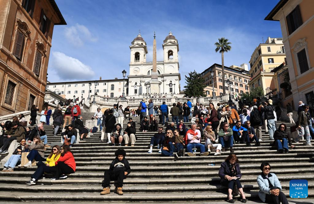 People enjoy leisure time at Spanish Steps in Rome, Italy, March 18, 2026. (Xinhua/Wang Kaiyan)