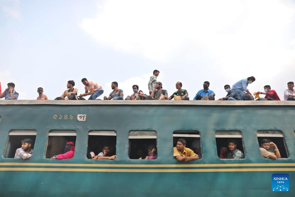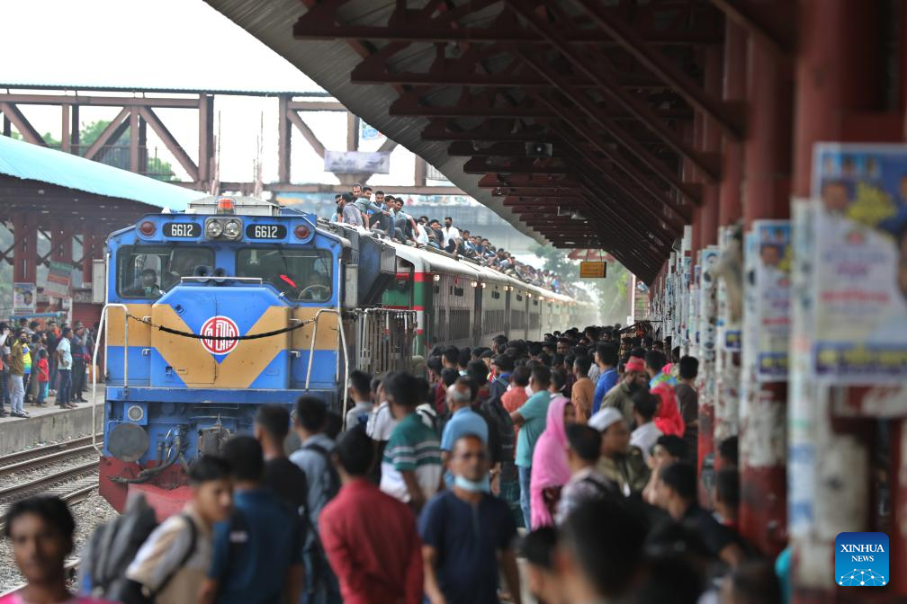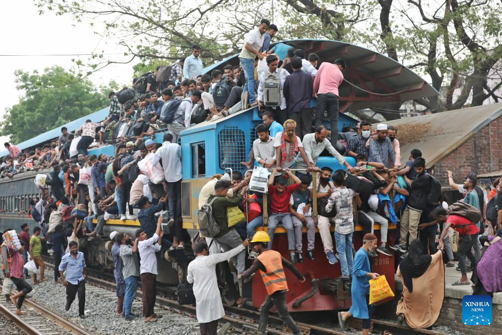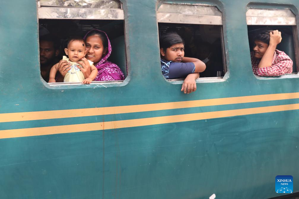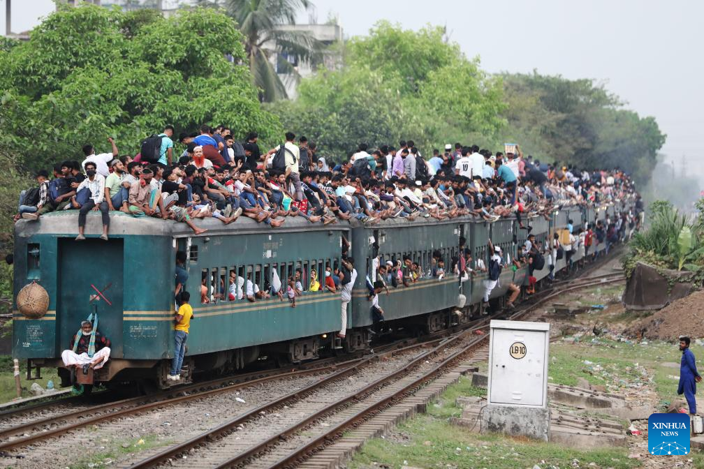 People take a train for returning home at Tongi Railway Station in Gazipur, Bangladesh, March 18, 2026. The station here is packed with huge number of home-bound passengers as the Eid al-Fitr is drawing near. (Photo by Habibur Rahman/Xinhua)