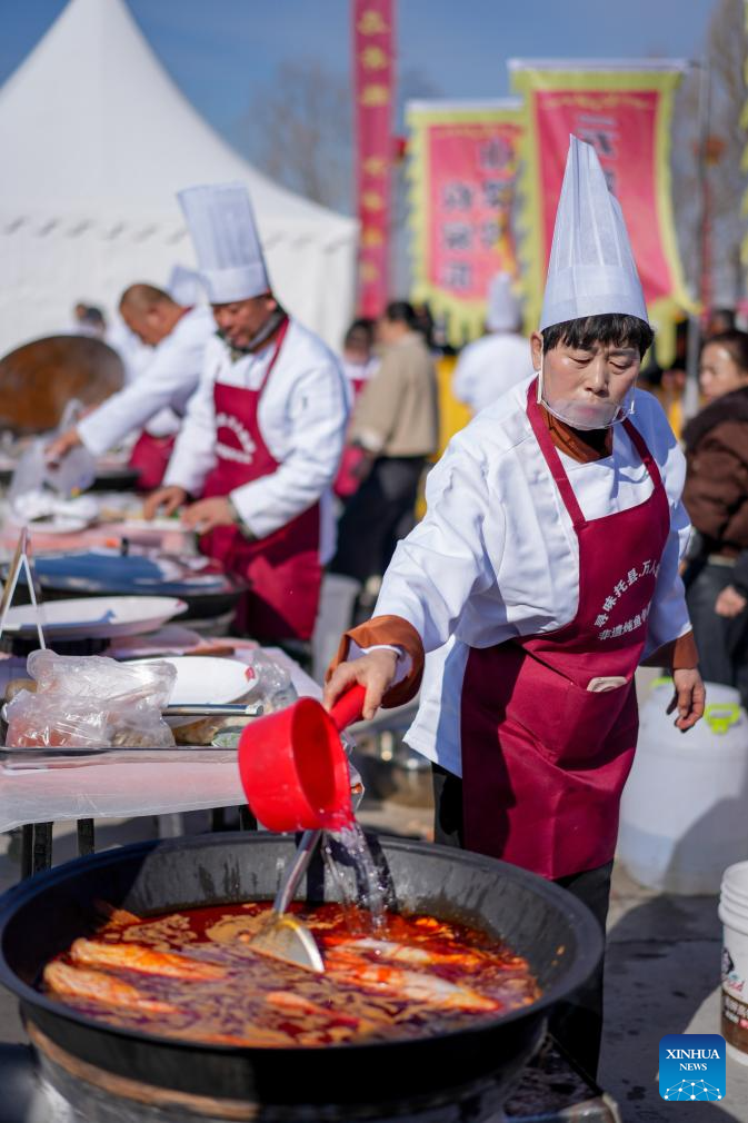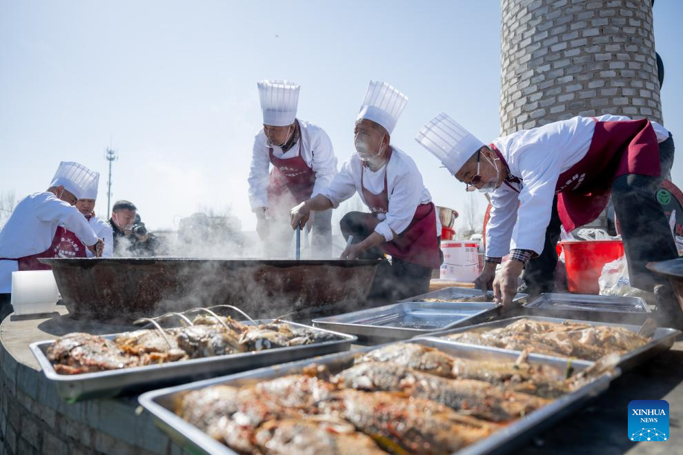 Chefs cook fish dishes during a folk culture week in Hohhot, north China's Inner Mongolia Autonomous Region, March 20, 2026. People took part in various events such as watching performances, tasting fish dishes, enjoying folk customs and visiting markets during a folk culture week which opened here on Friday to celebrate the thawing Yellow River. (Xinhua/Lian Zhen)