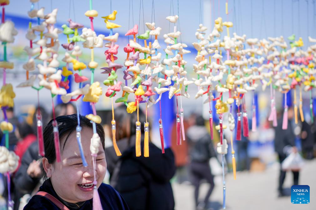 People watch dough figurine artworks during the opening ceremony of a folk culture week in Hohhot, north China's Inner Mongolia Autonomous Region, March 20, 2026. People took part in various events such as watching performances, tasting fish dishes, enjoying folk customs and visiting markets during a folk culture week which opened here on Friday to celebrate the thawing Yellow River. (Xinhua/Lian Zhen)