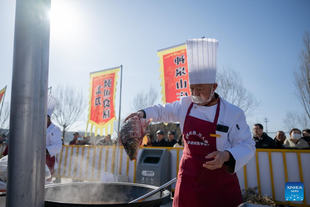 A chef cooks a fish dish during a folk culture week in Hohhot, north China's Inner Mongolia Autonomous Region, March 20, 2026. People took part in various events such as watching performances, tasting fish dishes, enjoying folk customs and visiting markets during a folk culture week which opened here on Friday to celebrate the thawing Yellow River. (Xinhua/Lian Zhen)