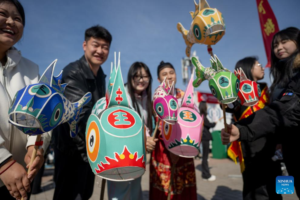 People pose for a photo with fish lanterns during a folk culture week in Hohhot, north China's Inner Mongolia Autonomous Region, March 20, 2026. People took part in various events such as watching performances, tasting fish dishes, enjoying folk customs and visiting markets during a folk culture week which opened here on Friday to celebrate the thawing Yellow River. (Xinhua/Lian Zhen)