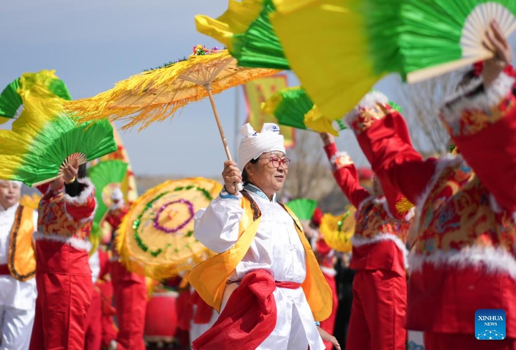 People perform Yangge dance during the opening ceremony of a folk culture week in Hohhot, north China's Inner Mongolia Autonomous Region, March 20, 2026. People took part in various events such as watching performances, tasting fish dishes, enjoying folk customs and visiting markets during a folk culture week which opened here on Friday to celebrate the thawing Yellow River. (Xinhua/Lian Zhen)