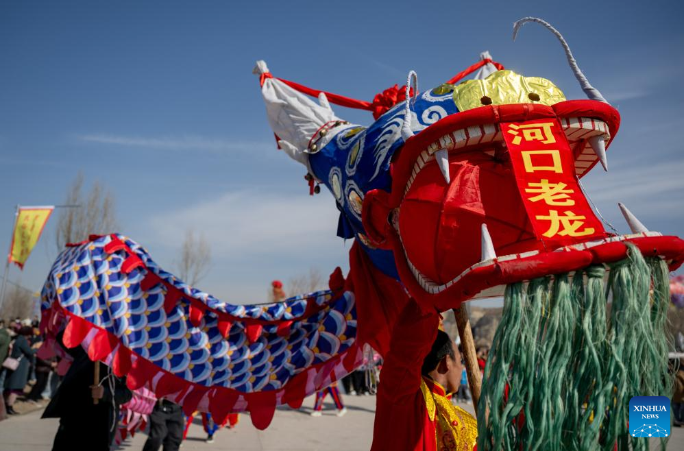 People perform dragon dance during the opening ceremony of a folk culture week in Hohhot, north China's Inner Mongolia Autonomous Region, March 20, 2026. People took part in various events such as watching performances, tasting fish dishes, enjoying folk customs and visiting markets during a folk culture week which opened here on Friday to celebrate the thawing Yellow River. (Xinhua/Lian Zhen)