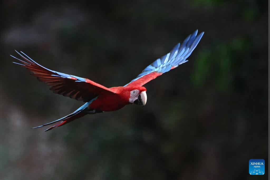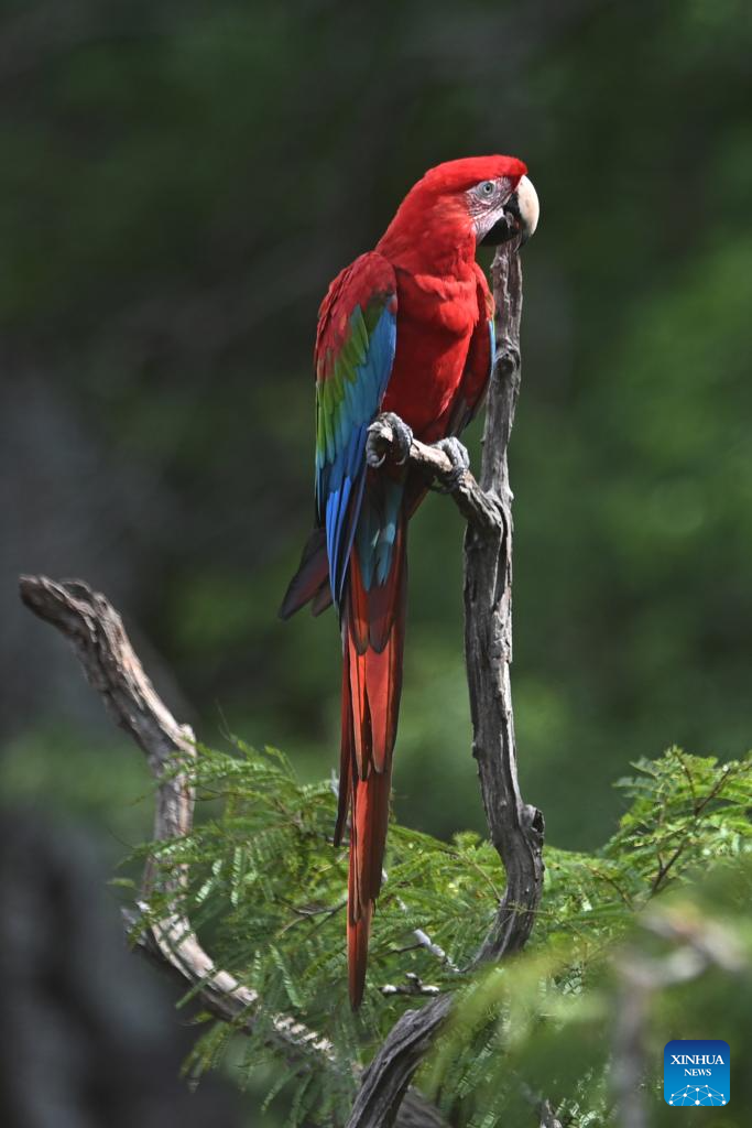 A red-and-green macaw is seen at the Macaw's Sinkhole in Jardim, Mato Grosso do Sul, Brazil, March 19, 2026. (Photo by Lucio Tavora/Xinhua)