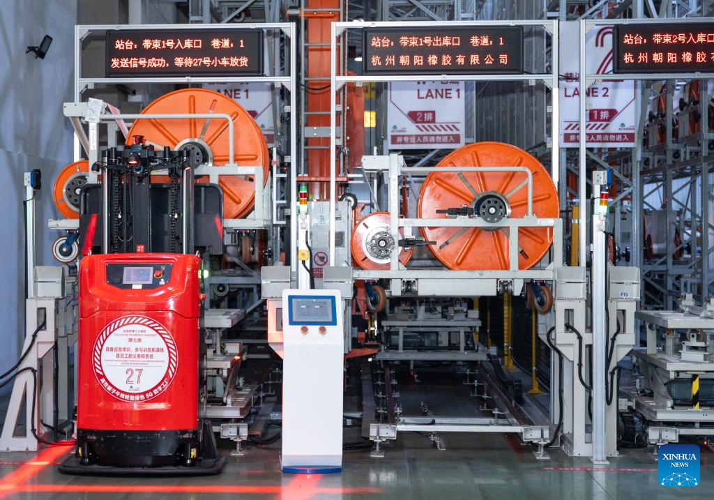 An undated file photo shows an AGV (Automated Guided Vehicle) transporting materials at a warehouse of Zhongce Rubber Group in Hangzhou, east China's Zhejiang Province. (Xinhua)