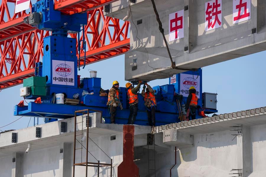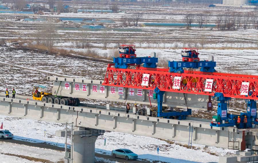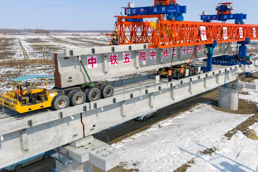 JIAMUSI, March 20 (Xinhua) -- The Tongjiang super major bridge, part of the capacity expansion and renovation project for the Jiamusi-Tongjiang Railway, resumed beam erection on Friday.