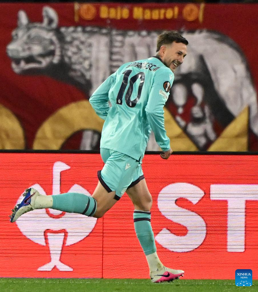 Bologna's Santiago Castro celebrates his goal during the UEFA Europa League round of 16 second leg match between Roma and Bologna in Rome, Italy, March 19, 2026. (Photo by Alberto Lingria/Xinhua)