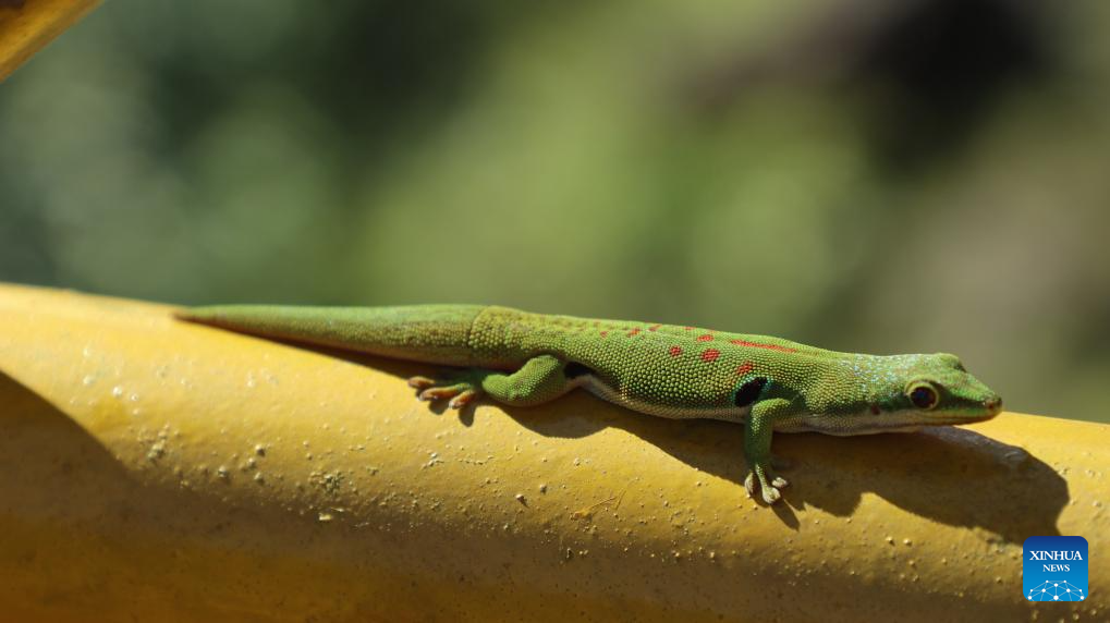 This photo taken on March 19, 2026 shows a day gecko at Ranomafana National Park in Fianarantsoa Province, Madagascar. The Ranomafana National Park is part of the Rainforests of the Atsinanana (Madagascar), which was inscribed on UNESCO World Heritage List in 2007. In Malagasy, "Ranomafana" means "hot water", reflecting the area's abundant geothermal resources. The park features well-preserved tropical rainforest, notable biodiversity, and a wide range of endemic flora and fauna. (Xinhua/Chen Shaohua)