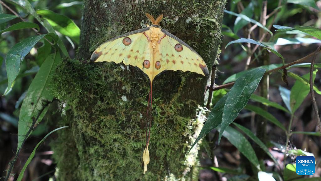 This photo taken on March 19, 2026 shows a comet moth at Ranomafana National Park in Fianarantsoa Province, Madagascar. The Ranomafana National Park is part of the Rainforests of the Atsinanana (Madagascar), which was inscribed on UNESCO World Heritage List in 2007. In Malagasy, "Ranomafana" means "hot water", reflecting the area's abundant geothermal resources. The park features well-preserved tropical rainforest, notable biodiversity, and a wide range of endemic flora and fauna. (Xinhua/Chen Shaohua)