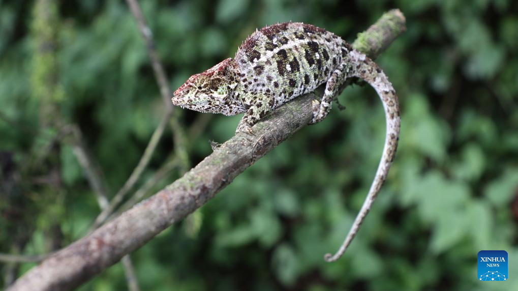 This photo taken on March 19, 2026 shows a chameleon at Ranomafana National Park in Fianarantsoa Province, Madagascar. The Ranomafana National Park is part of the Rainforests of the Atsinanana (Madagascar), which was inscribed on UNESCO World Heritage List in 2007. In Malagasy, "Ranomafana" means "hot water", reflecting the area's abundant geothermal resources. The park features well-preserved tropical rainforest, notable biodiversity, and a wide range of endemic flora and fauna. (Xinhua/Chen Shaohua)