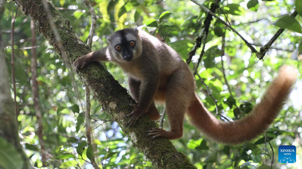 This photo taken on March 19, 2026 shows a brown lemur at Ranomafana National Park in Fianarantsoa Province, Madagascar. The Ranomafana National Park is part of the Rainforests of the Atsinanana (Madagascar), which was inscribed on UNESCO World Heritage List in 2007. In Malagasy, "Ranomafana" means "hot water", reflecting the area's abundant geothermal resources. The park features well-preserved tropical rainforest, notable biodiversity, and a wide range of endemic flora and fauna. (Xinhua/Chen Shaohua)