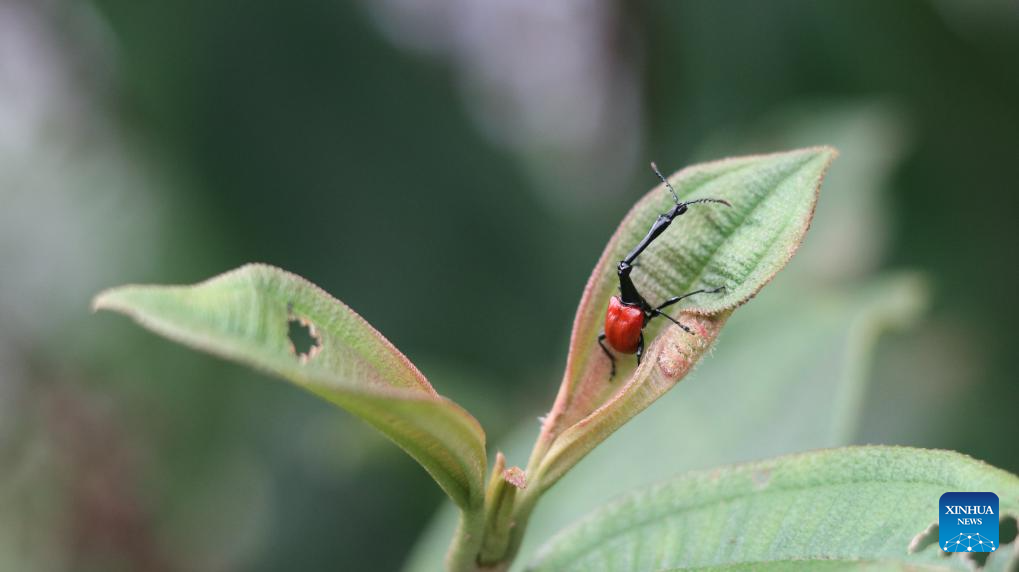 This photo taken on March 19, 2026 shows a giraffe-necked weevil at Ranomafana National Park in Fianarantsoa Province, Madagascar. The Ranomafana National Park is part of the Rainforests of the Atsinanana (Madagascar), which was inscribed on UNESCO World Heritage List in 2007. In Malagasy, "Ranomafana" means "hot water", reflecting the area's abundant geothermal resources. The park features well-preserved tropical rainforest, notable biodiversity, and a wide range of endemic flora and fauna. (Xinhua/Chen Shaohua)