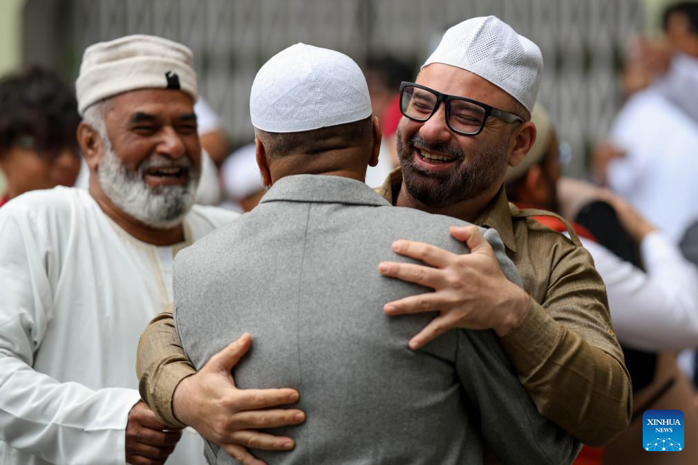 People greet each other while offering Eid al-Fitr prayers at a mosque in Kathmandu, Nepal, March 21, 2026. (Photo by Sulav Shrestha/Xinhua)