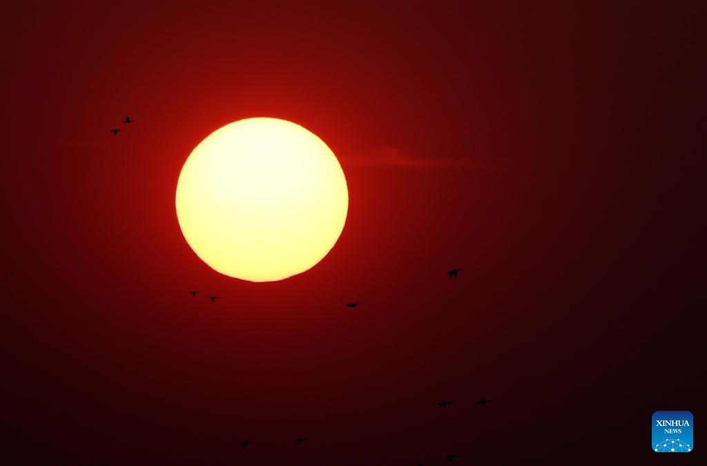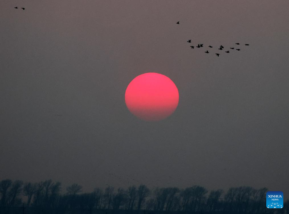 This photo taken on March 20, 2026 shows migratory birds at sunset over the Wolong Lake of Kangping County, northeast China's Liaoning Province. As temperature rises, a large number of migratory birds have flown to the Wolong Lake, attracting citizens and tourists to watch the birds and take photos. (Xinhua/Li Gang)