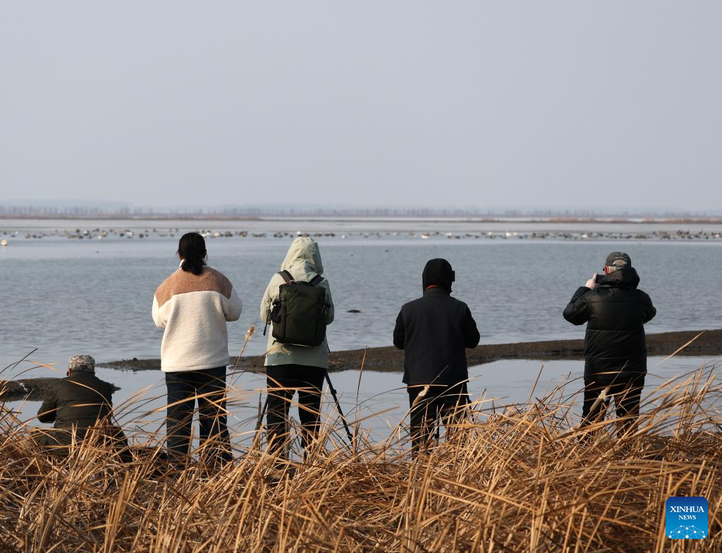 People take photos of migratory birds by the Wolong Lake of Kangping County, northeast China's Liaoning Province, March 20, 2026. As temperature rises, a large number of migratory birds have flown to the Wolong Lake, attracting citizens and tourists to watch the birds and take photos. (Xinhua/Li Gang)