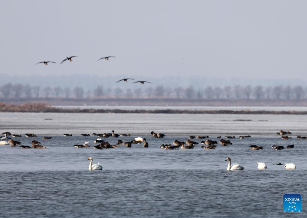 This photo taken on March 20, 2026 shows migratory birds on the Wolong Lake of Kangping County, northeast China's Liaoning Province. As temperature rises, a large number of migratory birds have flown to the Wolong Lake, attracting citizens and tourists to watch the birds and take photos. (Xinhua/Li Gang)