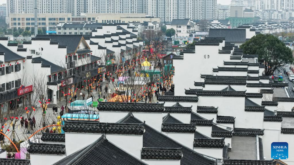 A drone photo taken on Jan. 31, 2026 shows the Modian old street in Hefei, east China's Anhui Province. Taking urban renewal as an opportunity, the city of Hefei in recent years has endeavored to identify the public needs and explored a pathway for urban renewal that takes into account both heritage of the old city and modern vitality, based on which a number of old places have been rejuvenated. (Photo by Zhang Min/Xinhua)