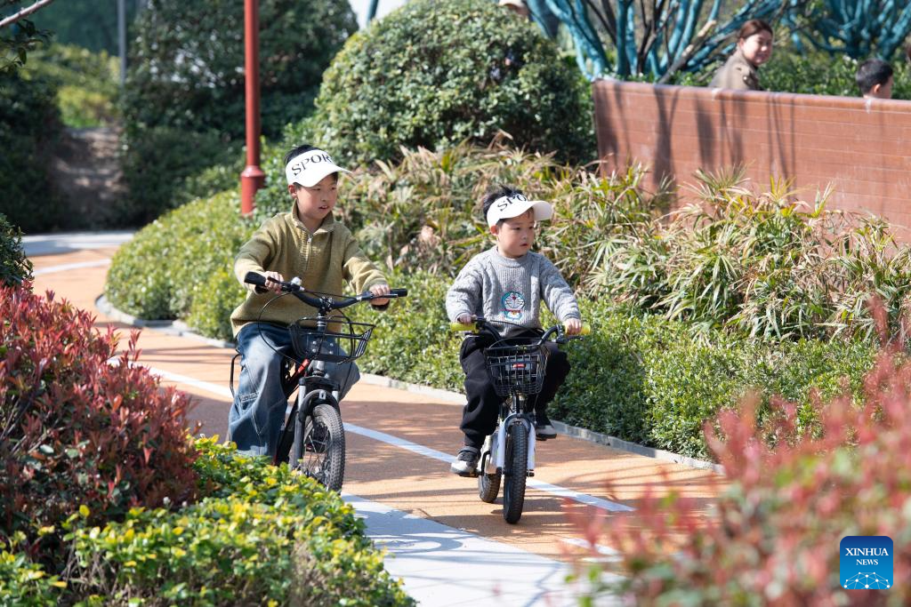 Children ride bicycles at a pocket park built on a former railway station in Yaohai District of Hefei, east China's Anhui Province, March 14, 2026. Taking urban renewal as an opportunity, the city of Hefei in recent years has endeavored to identify the public needs and explored a pathway for urban renewal that takes into account both heritage of the old city and modern vitality, based on which a number of old places have been rejuvenated. (Xinhua/Zhang Duan)