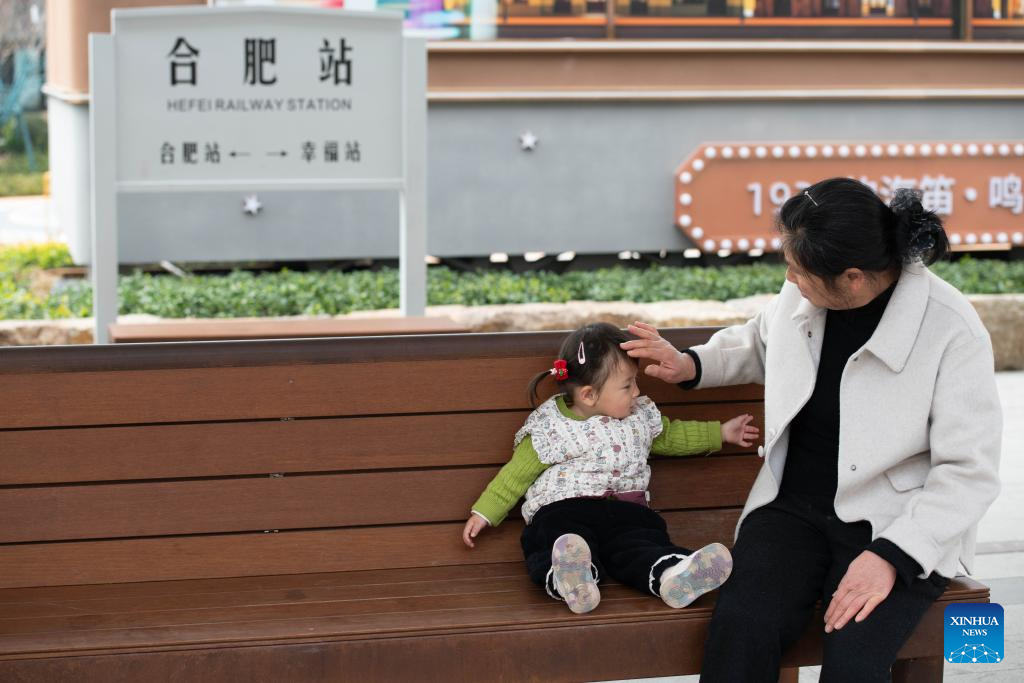 A woman and a child have fun at a pocket park built on a former railway station in Yaohai District of Hefei, east China's Anhui Province, March 11, 2026. Taking urban renewal as an opportunity, the city of Hefei in recent years has endeavored to identify the public needs and explored a pathway for urban renewal that takes into account both heritage of the old city and modern vitality, based on which a number of old places have been rejuvenated. (Xinhua/Zhang Duan)