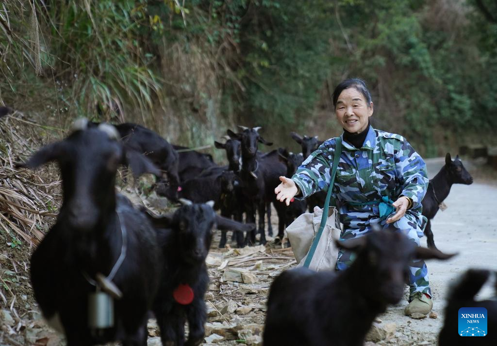 This photo taken on March 5, 2026 shows Wu Zhonghua greeting goats on her way home after patrolling at a forest farm at the Guanshan National Nature Reserve in Yifeng County of east China's Jiangxi Province.(Xinhua/Wan Xiang)