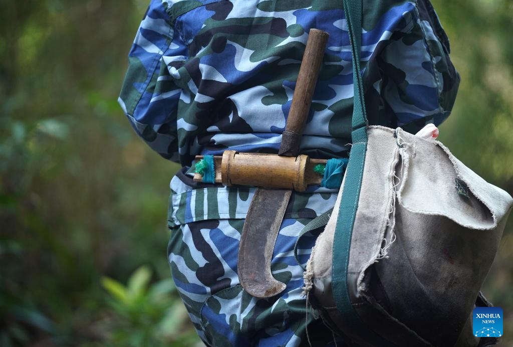 This photo taken on March 5, 2026 shows Wu Zhonghua patrolling with a firewood knife left by her father at a forest farm at the Guanshan National Nature Reserve in Yifeng County of east China's Jiangxi Province.(Xinhua/Wan Xiang)