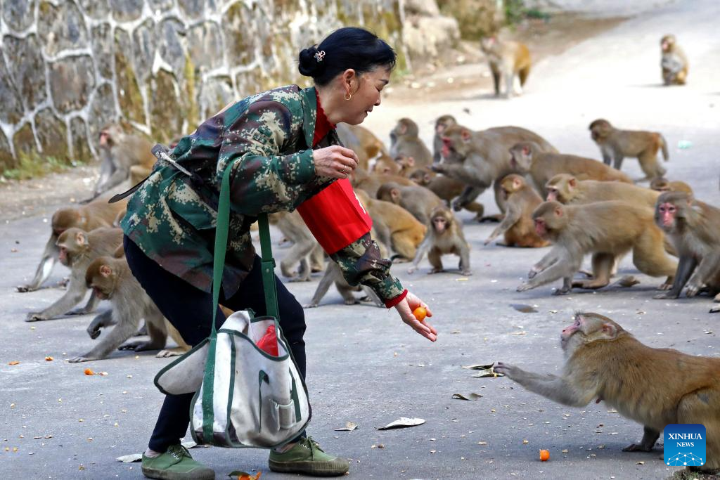 This photo taken on Feb. 3, 2021 shows Wu Zhonghua interacting with wild macaques at a forest farm at the Guanshan National Nature Reserve in Yifeng County of east China's Jiangxi Province.(Photo by He Jianlai/Xinhua)