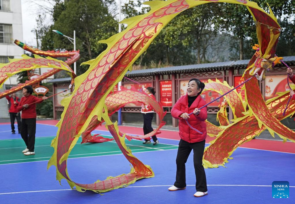 This photo taken on March 5, 2026 shows Wu Zhonghua (1st R) practicing ribbon dance at a forest farm at the Guanshan National Nature Reserve in Yifeng County of east China's Jiangxi Province.(Xinhua/Wan Xiang)