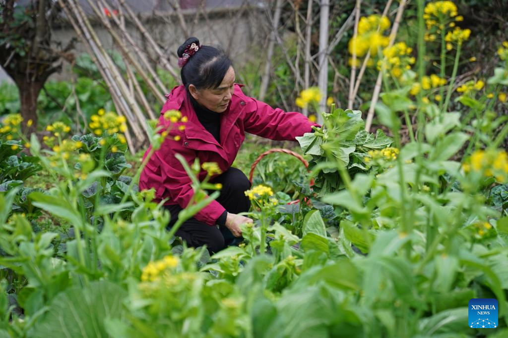 This photo taken on March 5, 2026 shows Wu Zhonghua harvesting vegetable near her home at a forest farm at the Guanshan National Nature Reserve in Yifeng County of east China's Jiangxi Province.